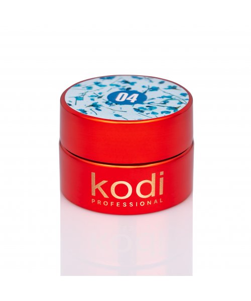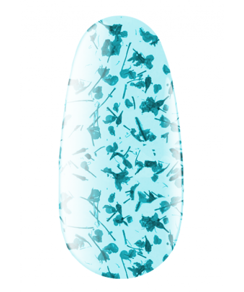 Shade No. 04 is blue with the addition of dried flowers. The gel resembles a drop of water in which the subtle outlines of plants are read. The product has a moderately dense consistency, is easily and evenly distributed over the nail plates, and polymerizes in lamps of any type.