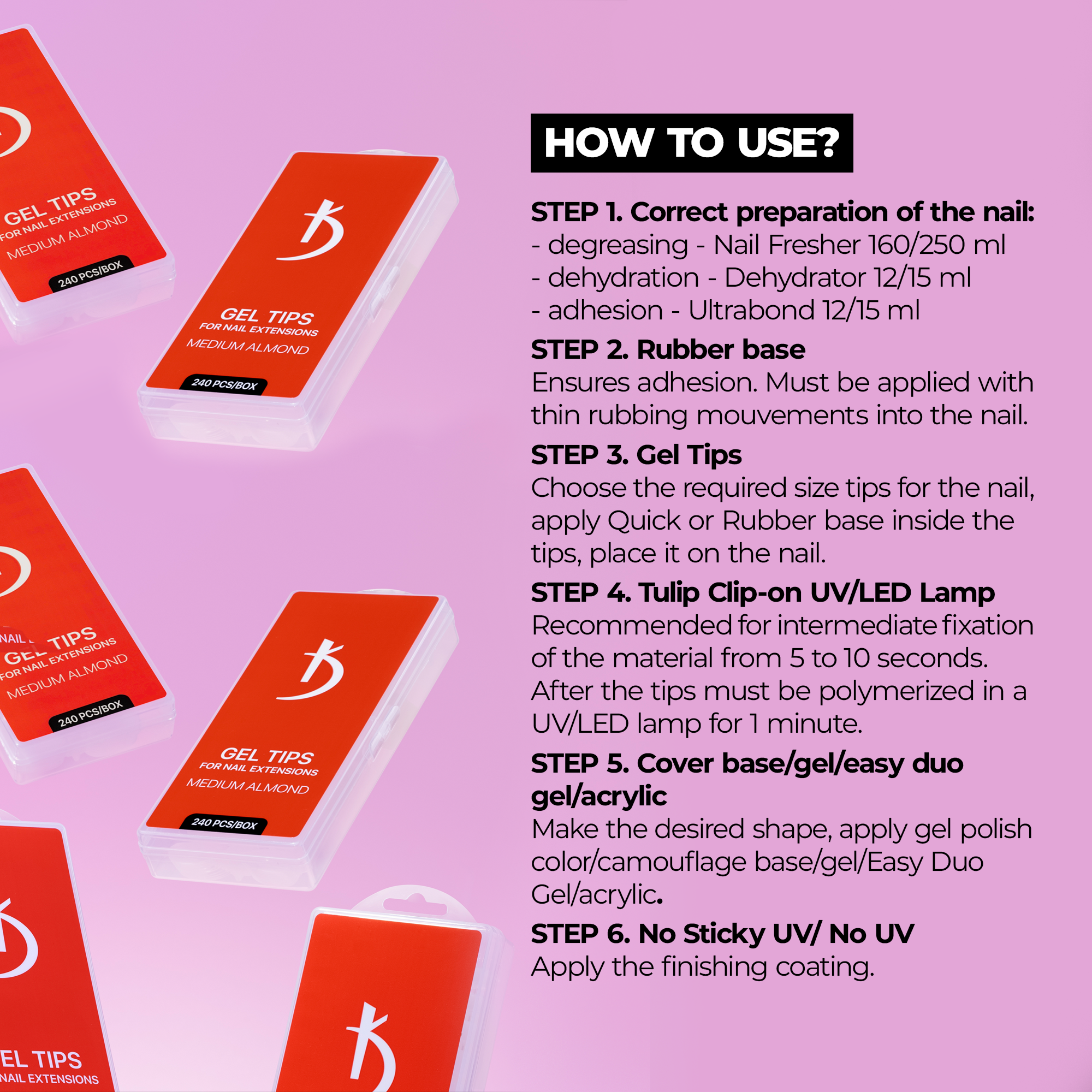 2. Select a tip of the appropriate size, apply base to the tip and attach it to the nail, place carefully in an UV lamp until complete polymerization.