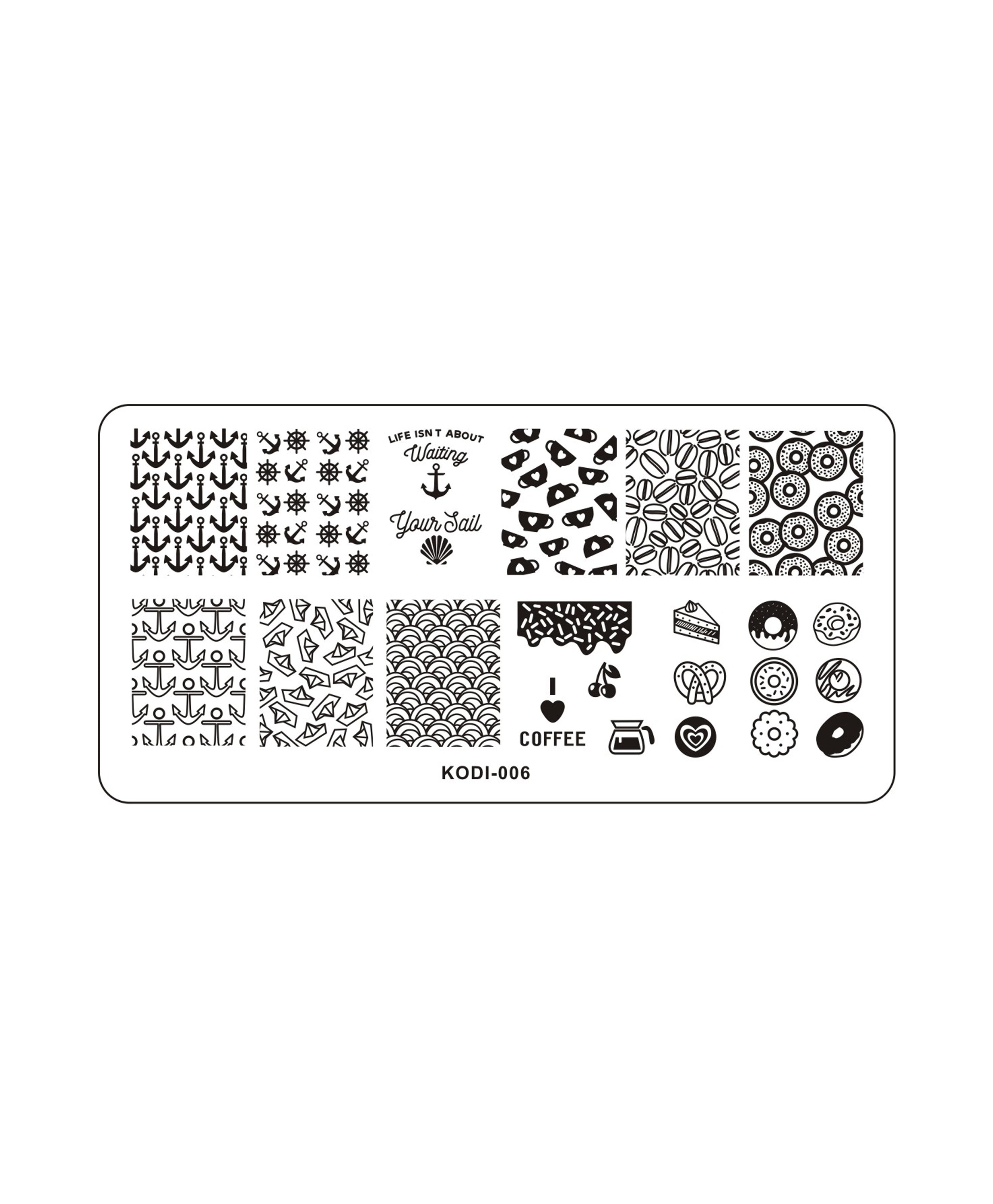 Stamping won love of the masters thanks to the ability to create a variety of patterns and ornaments on the nails in a simple and easy way using the method of imprinting, and with maximum accuracy and neatness. In addition to coating materials, a stamping design will require a scraper, a stamp and a plate with ready-made patterns. Smooth polished metal stamping plate Kodi-006 contains 6 nautical-themed patterns, 4 coffee-themed patterns and drawings.
